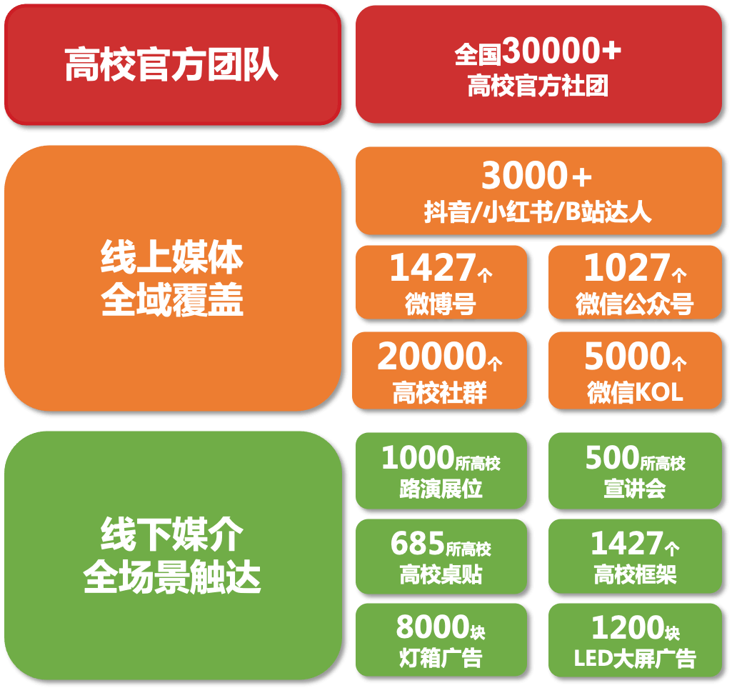 With the mission of "Your Loyal Helper in Brand Rejuvenation", the company provides efficient and accurate one-stop marketing and promotion services for enterprises by virtue of keen creative insight, excellent marketing planning ability, rich experience in event management and all-round campus media resources. It has become a supplier in the world's top 500 brands such as P & G, Tencent, JD, China Unicom and ByteDance.